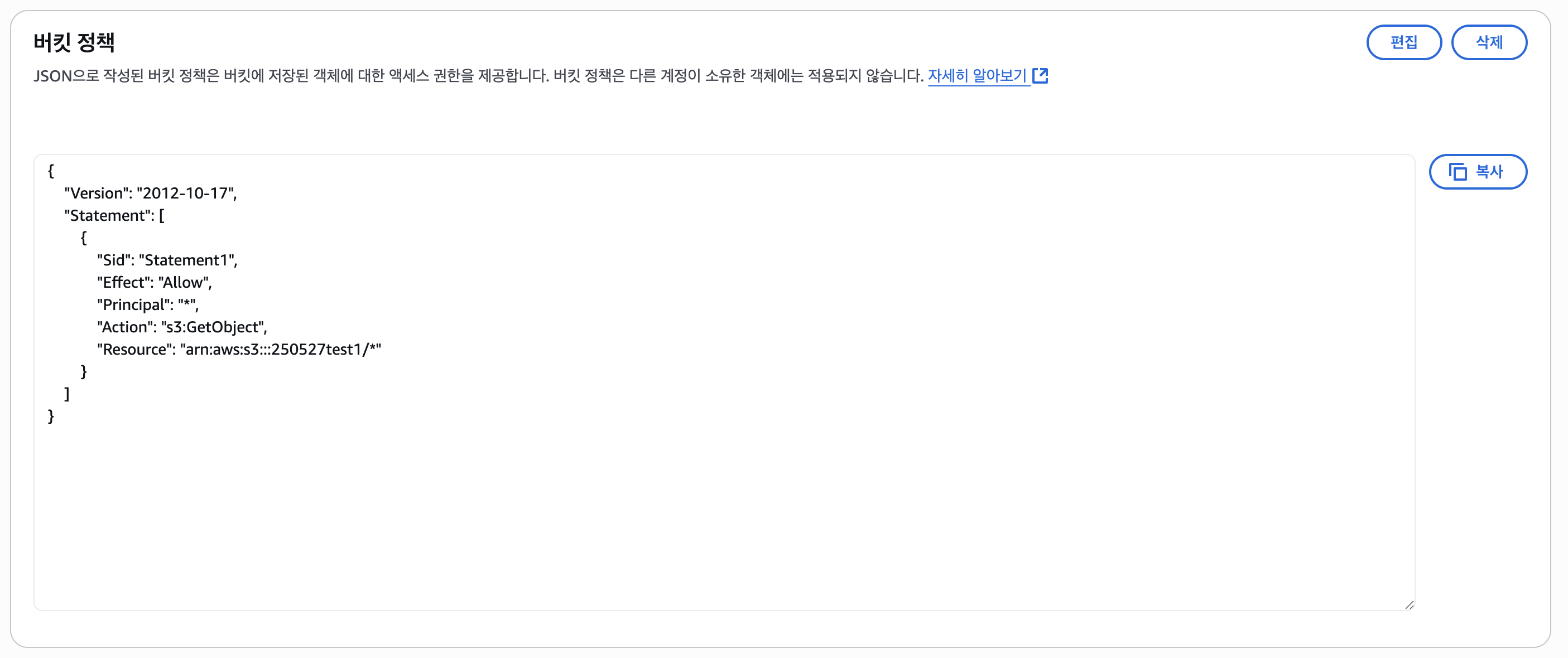 [권한] → [버킷 정책] 에 다음 JSON을 추가했음