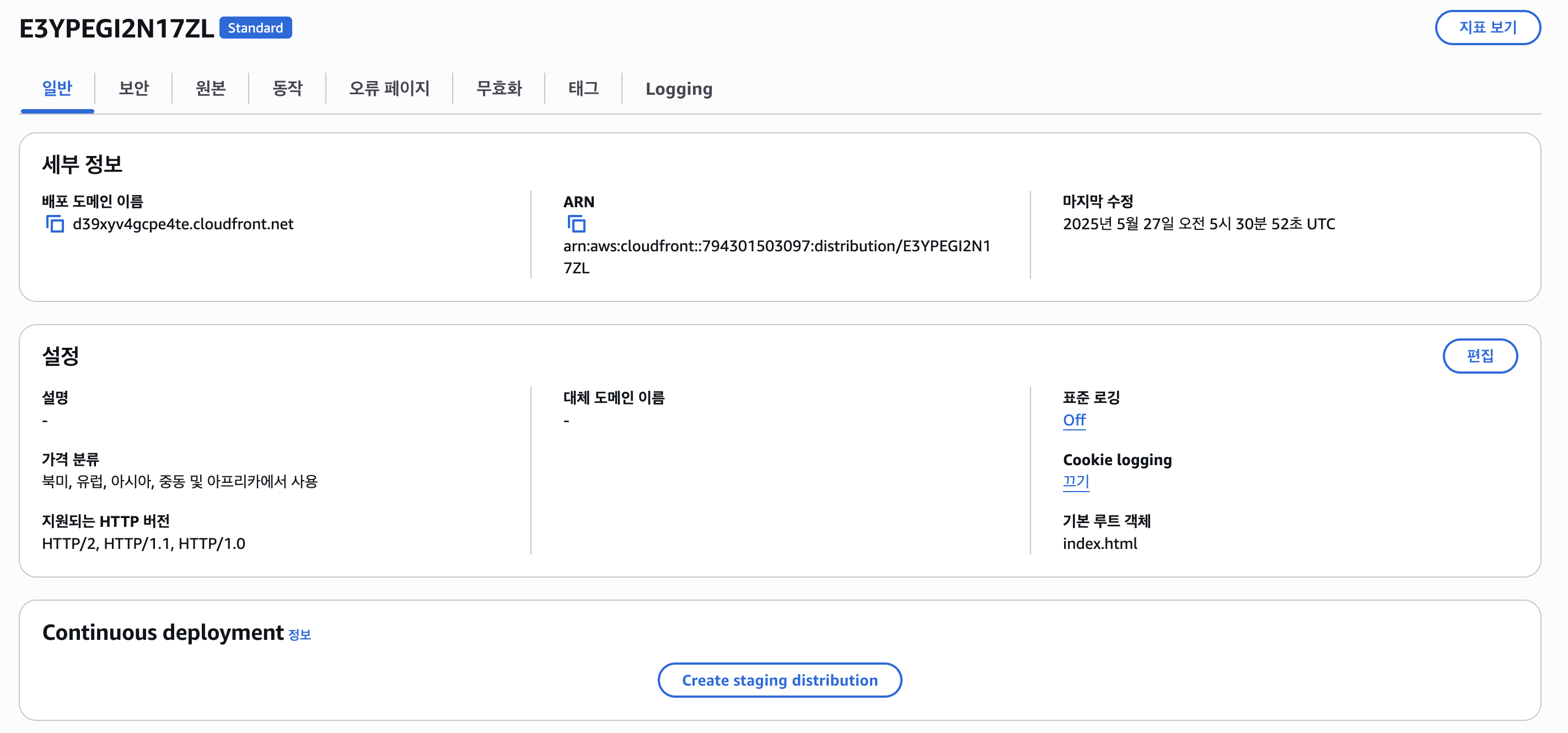 - 배포가 완료되면, CloudFront가 제공하는 도메인 이름이 생김